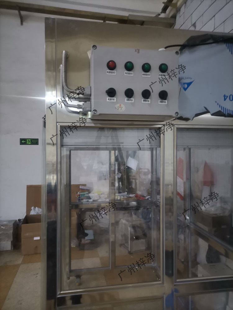 5、工作區兩側為不銹鋼擋板,前后為條形防靜電防塵垂簾,達到理想防塵效果。“梓凈”牌防爆潔凈采樣車名牌6、配一臺大風量低噪聲進口風機0.165KW,確保風速大于0.45m/s;