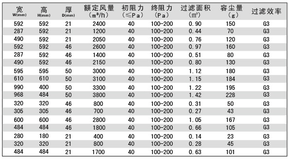 用戶選購指南-板式初效活性炭過濾器技術參數